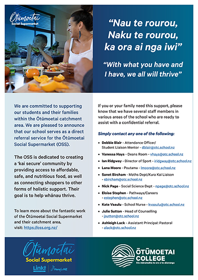 We are committed to supporting our students and their families within the Ōtūmoetai catchment area. We are pleased to announce that our school serves as a direct referral service for the Ōtūmoetai Social Supermarket (OSS).