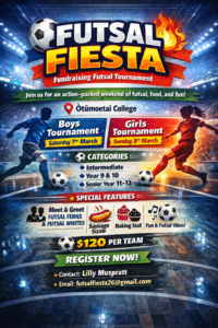We are excited to invite your school to enter a team in Futsal Fiesta, an indoor futsal fundraising tournament being hosted at Ōtūmoetai College this March.